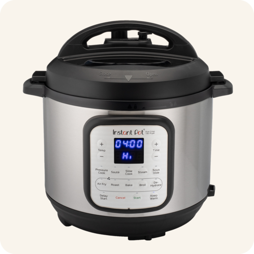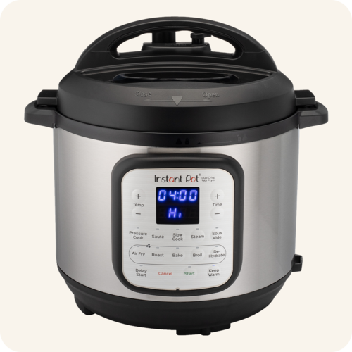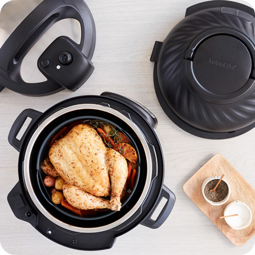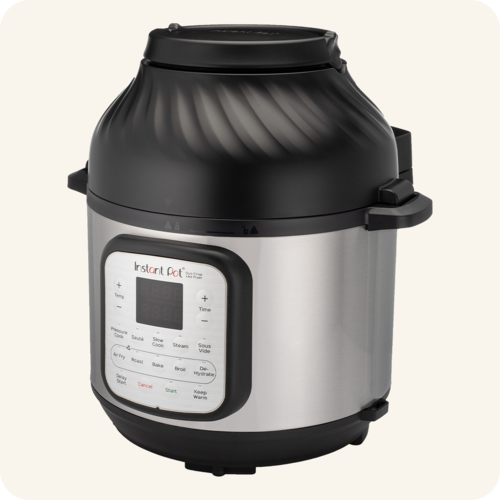 Duo™ Crisp™ vine cu două capace interschimbabile – unul pentru gătire sub presiune și unul pentru prăjire cu aer – astfel încât să începi cu mese suculente și fragede și să le termini cu o crustă aurie perfectă. Cu 11 programe inteligente personalizabile, poți pregăti feluri principale, garnituri și gustări toate într-un singur vas. Funcțiile de gătit includ: prăjire cu aer, friptură, copt, deshidratare, gătire sub presiune, gătire lentă, sote, abur, sterilizare, menținere la cald sau prepararea orezului – toate cu ușurință.